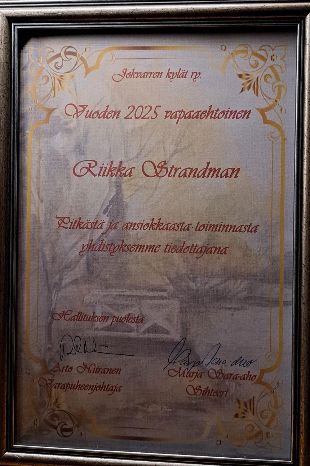 17.1.2026 Kylätalo Visalassa tilaisuus, jossa Riikka Strandmannille annettiin vuoden 2025 vapaaehtoinen kunniataulu. Taulun ojensi varapuheenjohtaja Arto Niiranen.
